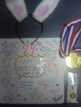 20代最後という事でロウソクを2本吹き消し、プレゼントにアクアウォークみんなの寄せ書き色紙(感涙です( TДT)、毘ストラップ(また携帯ストラップが増えました(*'-')、金メダル(金メダル級の指導員?)、ウサ耳(謎です(^_^;)を貰いました。