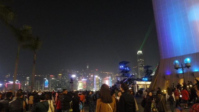 地下鉄で移動、尖沙咀にて毎日行われているシンフォニー・オブ・ライツを見に行きました。既に大勢の人。音楽と光の協演を楽しみました。北京オリンピックの聖火トーチが置いてありましたが、見たかったブルーリー像はアベニュー・オブ・スターズが閉鎖中で見られませんでした。