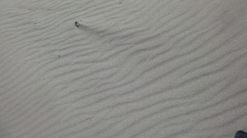 姿は見えないものの鳥の囀る声がする。まさか; ・`ω・´)!と「蟲師続章」において”囀る貝”という話を見たばかりでだったので、その現象かと刹那思ったが、良く見ると鳥の足跡が至るところに残っている。きっと砂の上に僅かばかりある植物の影に潜んでいるんだろう。 引き寄せらる様に海に向かって歩を進めると、或る境界を境にして優しい波の音が一帯を覆っていた。その安らぎに暫く時間を忘れて佇む。