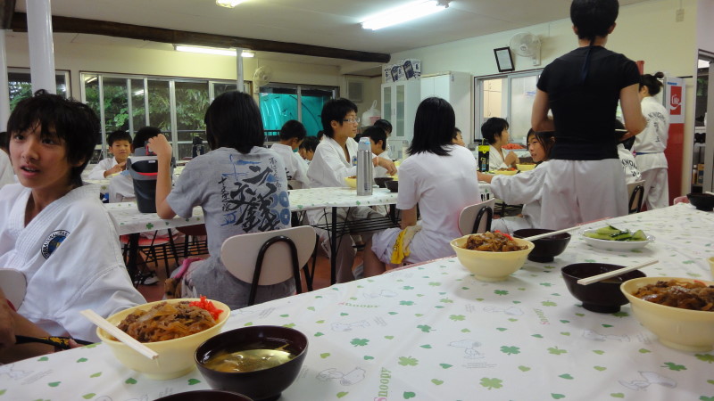 《 画像はBrightさんのブログから無断借用(´・ω・`)W烈風拳!! 》 終戦の後は昼食に合宿定番のカレーを頂き、戦勝の余韻も束の間にいよいよ午後練習のスタート!様々なメニューで練習を行いましたが、時間を測っての連続蹴りがハードでした(*_*; 使い古されたTシャツの様になって合宿所に戻り、安らぎと憩いの夕食の時間へ・:*:・(*´∀`*)・:*:・やりきった後の食事はまた格別です!Kotoちゃんのソース萌サービスに心癒されます(*^_^*)