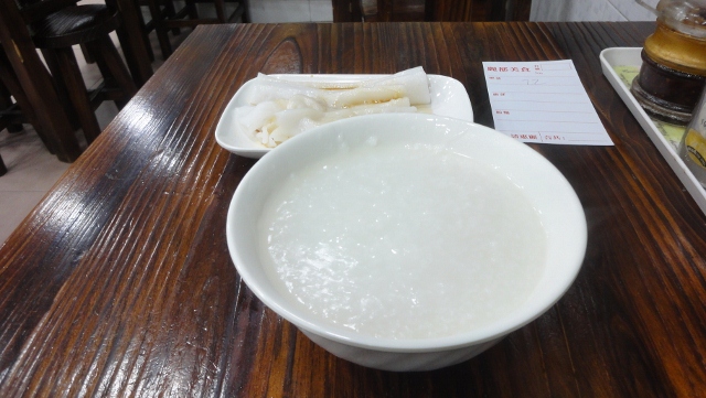 朝食セットらしくメニューから3つ選べとの事、しかしメニューには漢字しか書いてありません。しばし思案の末、白粥の漢字は分かったのでそれともう一つ勘でオカズになりそうな物と最後は珈琲を頼みました。 ……………。