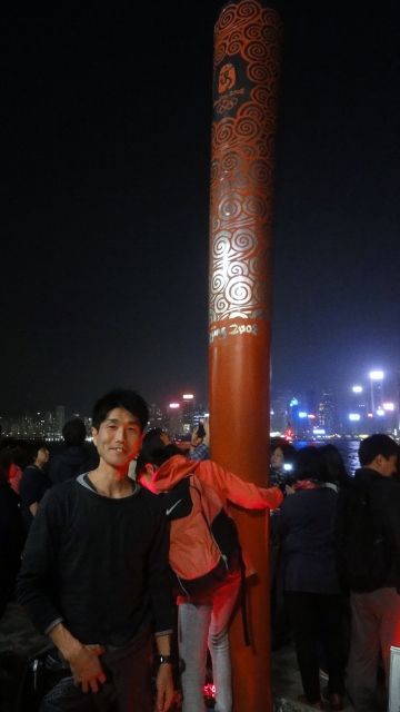 地下鉄で移動、尖沙咀にて毎日行われているシンフォニー・オブ・ライツを見に行きました。既に大勢の人。音楽と光の協演を楽しみました。北京オリンピックの聖火トーチが置いてありましたが、見たかったブルーリー像はアベニュー・オブ・スターズが閉鎖中で見られませんでした。