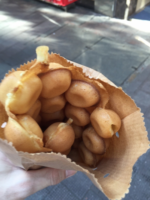 身振りでランチセットA・Bがあるよみたいな感じだったので勘でBを選ぶ。昨日の白い悪魔を想起しましたが出てきたのは酢豚セットでした。普通に美味しいね(*´ω`*)と堪能していると自然におじさんが対面に相席。運命の出会いってきっとこういう所から始まるのかなと妙な親近感を覚えましたが、当然会話も交わすことなく店を後にしました。 昼食を取りホテルで休憩した後は地下鉄で銅鑼湾まで行くことにしました。周辺を散策しながら逆方向の灣仔駅方面へ、途中エッグワッフルを見つけ食べ歩き。…ずっと歩いてる。それでも異国の地の風景は飽きません。
