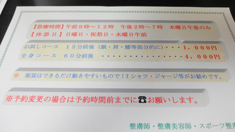 今回はお試し15分コースでお願い致しましたが、気持良く眠ってしまいそうでした。美容整膚、スポーツ整膚等々あるそうで悪い部分がある人はつまむと痛いらしいのですが、健康優良人間の僕には気持ちが良いだけで御座いました。