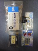 上杉謙信グッズは上杉家の家紋『竹に二羽飛び雀』キーホルダー(早速車の鍵に取り付けました)、義塩飴という毘の字が入った飴(仕事中に食べたいと思います)、毘と家紋シール(携帯、ギターに貼り付けました)をいただきました。