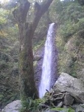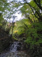見上げると円形の視界に紅色や橙色の葉が舞い散り、歩道に柔らかい絨毯を敷き詰めていま……だったら良かったのですが、まだ紅葉には早く葉は青々と茂っていました(^_^;)しかし自然のマイナスイオンを浴びて歩くのはとても気持ちがいいものです。20分程歩いたでしょうか、滝のある場所に到着。