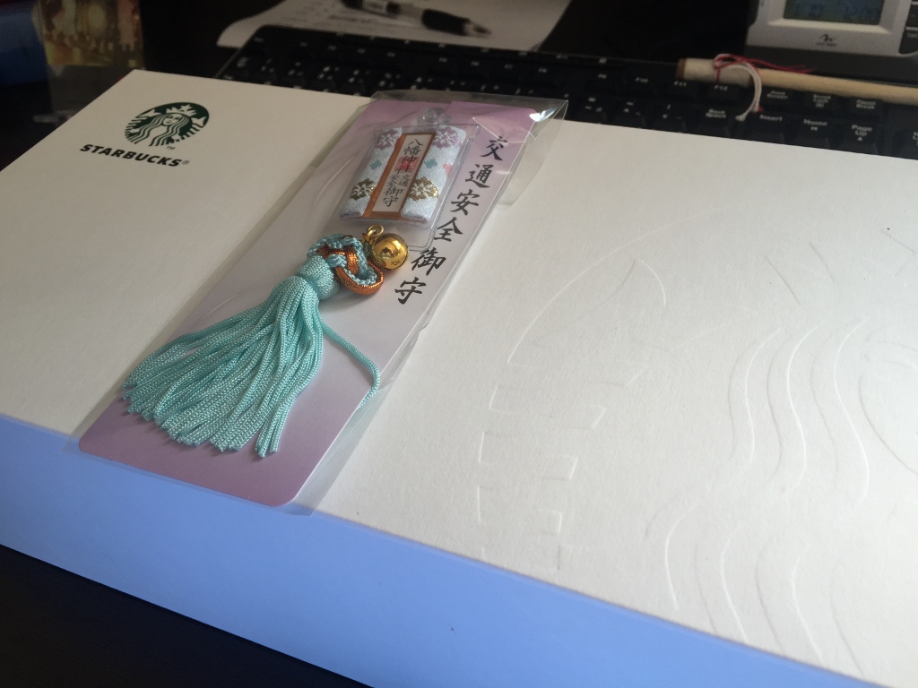 どうやらRisaちゃんが預かっていた模様です。コーヒーを水替わりに飲んでいる僕には嬉しい品(*´ェ`*)そして交通安全の御守も貰いゴールド免許が再び更新出来そうですヽ(´エ`)ノ気遣いに感謝しつつコーヒーに映る顔をぼんやり眺めています。