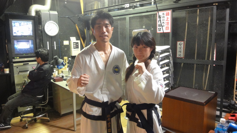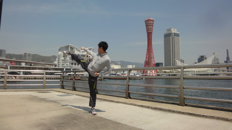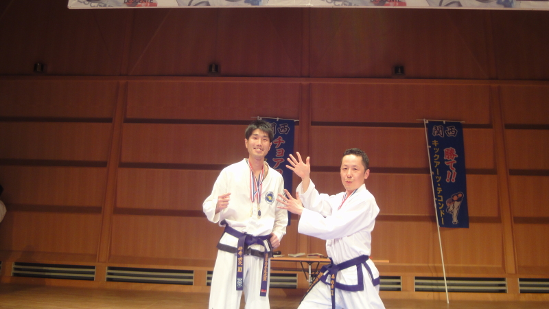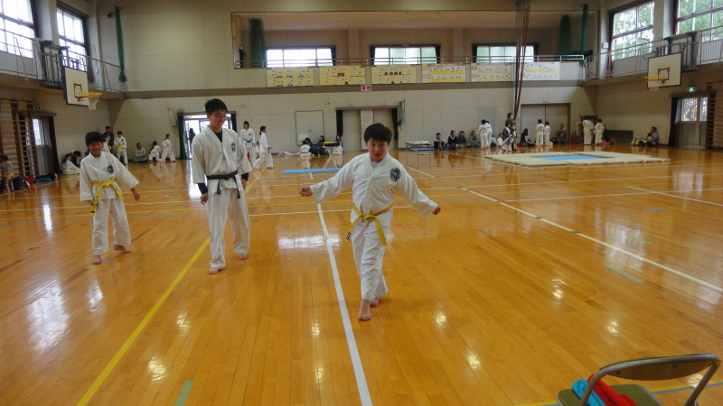 何故かやらずにはいられないスーパーサイドキックで記念撮影。ここで昼食もとり、いよいよ会場へと向かいます。 黒帯型の部、組手無差別級に出場。