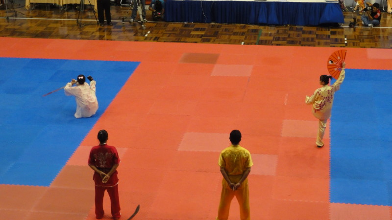 開会式では選手団の入場に始まり、WTF韓国団の演武。中国?の武術集団による武技の披露。ITF・NZの試割や半自由組手の演武等々が行われました。特に武器を使っての演武は見応えがありましたヽ(´ー`)ノ