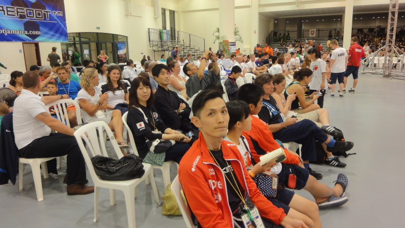 20時スタートの為まだ時間があります。ホテルに戻った後、実は示し合わせて浴衣を持ってきていたS師範と私、扇子片手に会場入りなのでありますヽ(=´▽`=)ノ アリーナの前列に陣取ります。