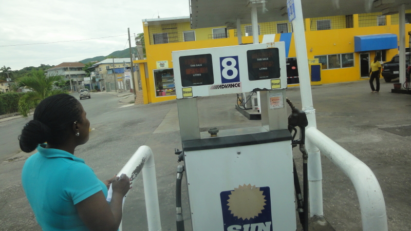 ガソリンスタンドに寄って給油。何かを手書きで記しています。ジャマイカでは手書きなのか(@_@;)と少々驚きつつも、今は懐かしい手書きのボウリング場を思い出しました。