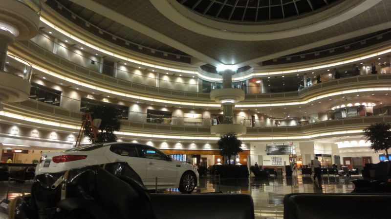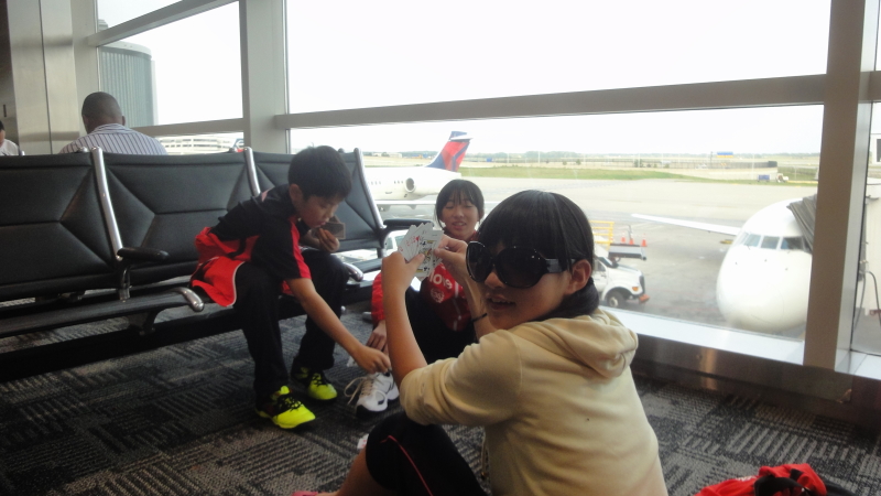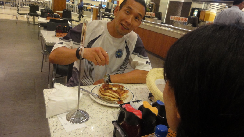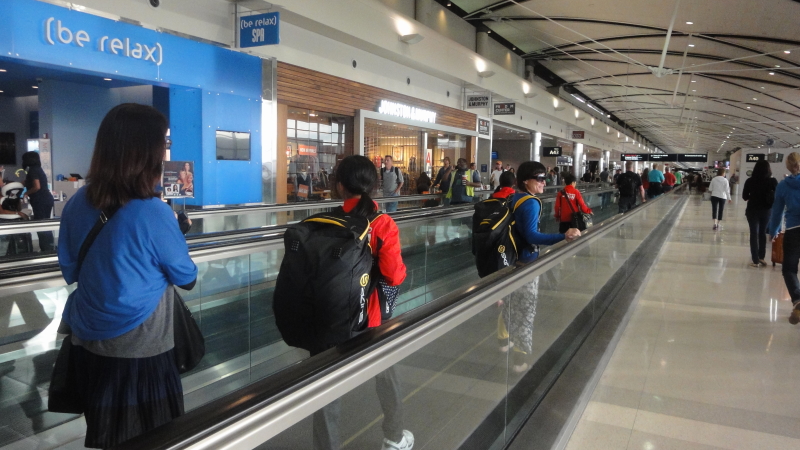 まずはデトロイトまで約12時間!映画三昧の時間が始まりました。アメイジング・スパイダーマン2等など、英語字幕がないのが唯一の不満であります( ゚д゚)。 デトロイトに到着、次の便まで7時間程あります(-_-;)しかしここで荷物のピックアップで少々トラブル、ナンダカンダで荷物の受け取り口で2時間くらい?いた様な…。その間は型の練習をしてみたり、寝てみたりと時間の経過を待ちます。僕が寝ている間にトラブルも解決し空港内を散策。