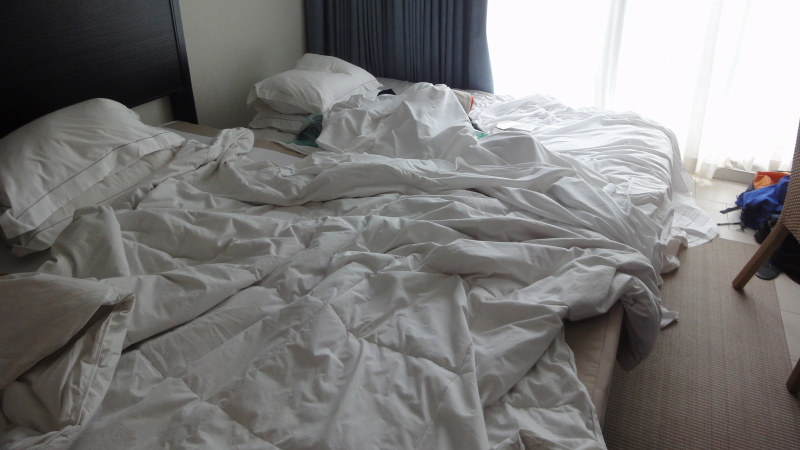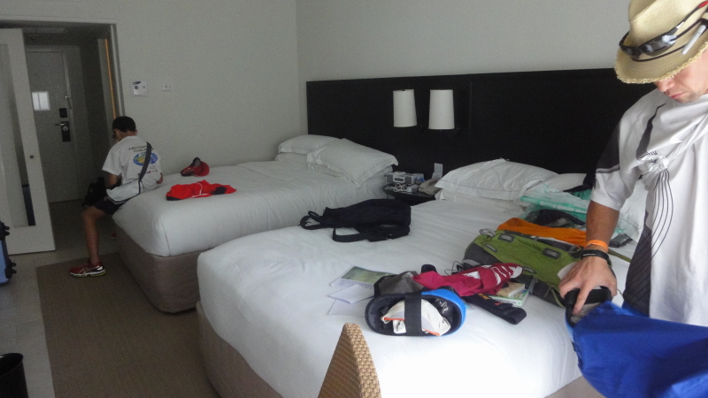 チェックインを済ませ謎のオレンジリストバンドを装着。今回は4人部屋での宿泊です。しかしベッドが2つしかありませんyo(;´∀`)しかし4人部屋で2つのベッドはアメリカワールドカップの時に経験済みです!こうすればいいのです! 上のマットを取り外して隣へ。固いマットの方が健康にはいいらしい……。という訳でこれで十分です。