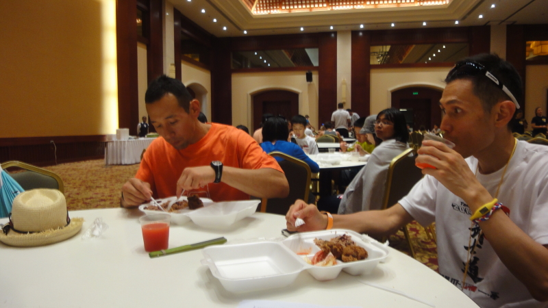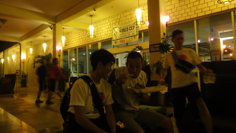 豆の入ったパサパサのご飯と有名なジャークチキン?とちょっとした野菜、大会期間中の食事は大概この組み合わせでした。眠りに就いていたChorusu師範とMs.Yokoの為に食事をデリバリーしようとホテルに持って帰ってきた所、「ホテルの中には持ち込めないルールだからここで食べて」。という事(-_-;)で起きなかったMs.Yokoの分をさっき食べたばかりなのに平らげるSugaya師範。